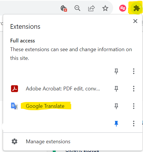 Når denne utvidelsen er lastet ned kan du finne den under "puslebrikke-symbolet" i verktøylinjen på din nettleser. Der kan du velge Google Translate og vil så få valget om å trykke på "Translate this Page"