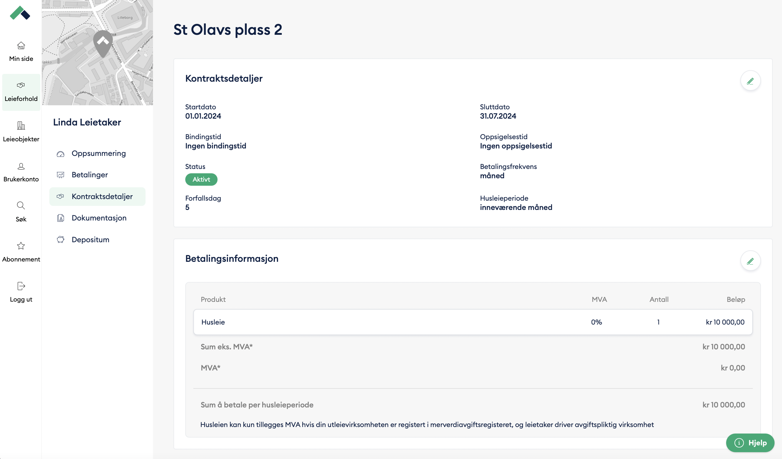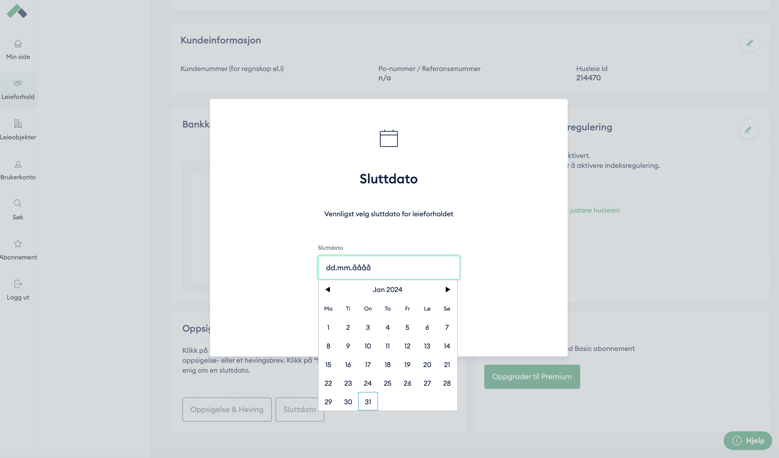 Dersom leietaker eksempelvis skal betale t.o.m. september må du sette sluttdato som 30.09.2023 og ikke 01.10.2023. Hvis ikke vil systemet sende en faktura for den ene dagen i påfølgende måned.